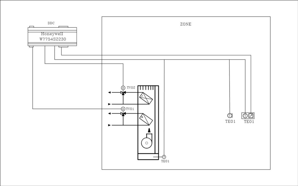 - ارسال فرمان سه دور کند، متوسط، تند به فن و فرمان قطع و وصل به شیرهای کنترل گرم و سرد توسط حلقه کنترلی PI از سنسور اتاقی/ سنسور کانالی هوای برگشت